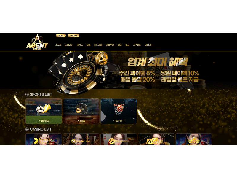에이전트카지노는 검은색과 메탈 골드 조합의 무거운 톤을 사용해 고급 테이블 게임의 분위기를 선호하는 이용자층을 겨냥합니다. 상단 히어로 배너에서 **주간 페이백 5%, 당일 페이백 10%, 매일 돌발 20%, 레벨별 콤프** 같은 키워드를 전면에 배치해 ‘상시 보상’과 ‘레이어드 리워드’를 브랜드 정체성으로 밀고 있습니다. 운영 관점에서 본 사이트는 스포츠/인플레이, 라이브 카지노, 슬롯, 미니게임으로 균형을 맞추되, **등급별 콤프**와 **주간/당일 페이백**을 리텐션 중심 기능으로 설계한 점이 특징입니다. 본 리포트는 화면 구성, 운영 기조, 보안/정책, 결제·정산 동선, 그리고 제공 이벤트의 실제 운영 맥락을 종합 분석하여 이용 전 체크리스트를 제공합니다.